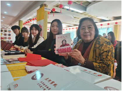 今年80多岁的韩月琴老师是国家级非物质文化遗产代表性传承人,她也特意带着自己的作品来到现场,与“00后”大学生们交流互动,通过一幅幅作品的讲解,通过《剪纸人生》这本回忆录,让大学生感受非遗文化的魅力,大学生们还动手剪出了人生第一幅剪纸作品。
