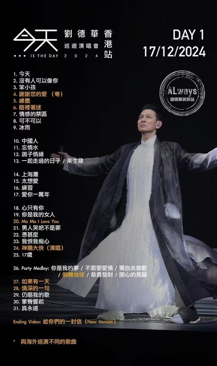 这次线上演唱会并非直播,而是刘德华从2024年持续到2025年初的“今天…is the Day”巡回演唱会的剪辑线上回放。所以曲目从第一首《今天》到最后一首《真永远》,顺序都没有打乱,只是混剪了演唱会现场不同机位的录制素材,从视觉感官来说,更近、更能看清表情、服装、舞台设计等细节。